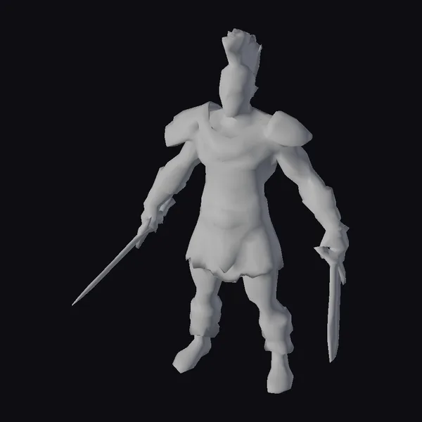 The Ancient Warrior Gladiator stands in a powerful pose, his muscular body accentuated by the dynamic lighting that highlights his defined abs and arms. His red mohawk adds a pop of color against the metallic sheen of his armor, which includes shoulder pads, a chest plate, and greaves. The swords in his hands, one extended to the side and the other held back, suggest a moment of tension before the battle. The detailed textures of his armor and the realistic proportions of his body make this model a stunning addition to any project. Ideal for use in games, animations, or 3D printing, this model brings the intensity of an ancient gladiator to life.