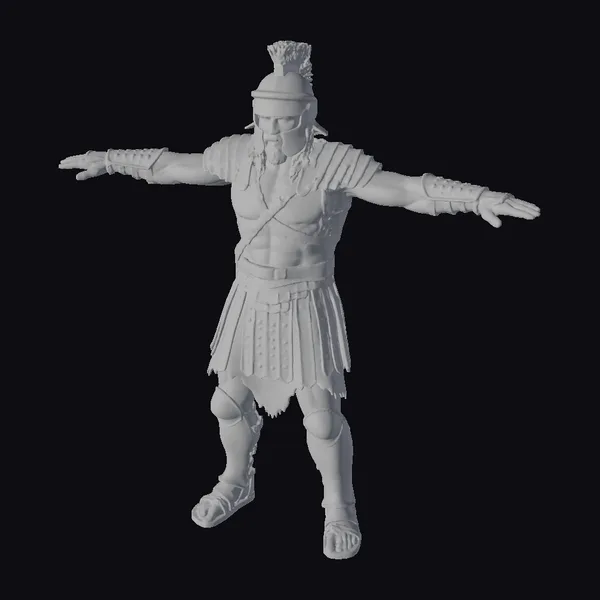 Detailed from the rugged texture of his sandals to the metallic sheen of his armor, this 3D model of a Roman gladiator captures the essence of ancient combat. His arms are outstretched, as if embracing the horizon or summoning the gods. The armor, a mix of leather and metal, is meticulously crafted, with a distinctive red crest on his helmet adding a pop of color. This model is perfect for projects requiring a historical or mythological touch, such as animations, games, or architectural visualizations. Its realistic style ensures a lifelike portrayal that can enhance any scene.