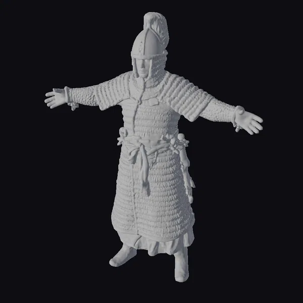Standing tall with arms outstretched, this ancient warrior is a testament to the craftsmanship and bravery of a bygone era. The lamellar armor, with its interlocking scales, provides a textured, almost lifelike appearance, while the earthy tones and weathered finish suggest countless battles and a storied past. The warrior’s helmet, topped with a vibrant red crest, adds a pop of color and signifies his status or allegiance. The detailed belt and scabbard add to the authenticity, hinting at the stories this warrior could tell. Ideal for historical reconstructions, animations, or game environments, this model brings the grandeur of ancient warfare to your fingertips.