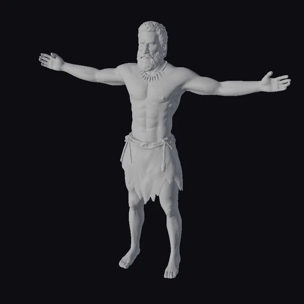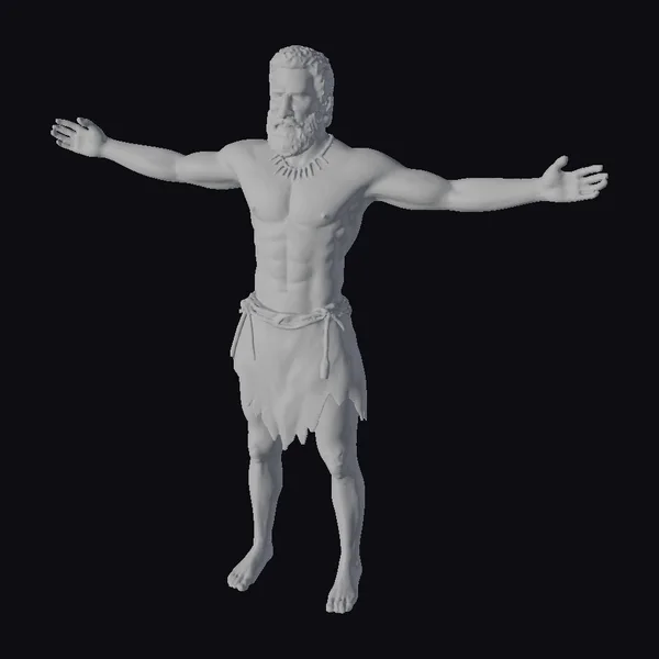 Detailed with precision, this 3D model of an ancient warrior showcases a robust physique, complete with defined muscles and a commanding presence. His dark hair and beard frame a resolute face, while his arms are outstretched in a gesture of defiance or invitation. The loincloth, tied at the waist with a leather thong, and the necklace, fashioned from what appears to be bone or stone, contribute to his ancient, tribal look. The model’s realistic style makes it suitable for various applications, including game development, animation projects, and architectural visualizations where historical or mythological accuracy is desired. Its high level of detail, especially in the facial features and musculature, ensures it can be used to convey a range of emotions and actions.