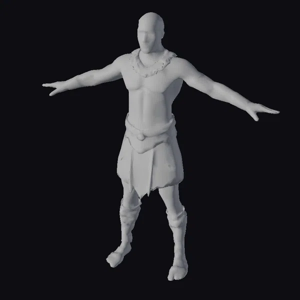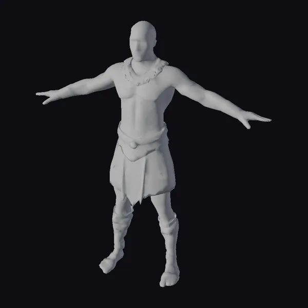 Detailed in every aspect, this 3D model of an ancient warrior showcases a robust physique, complete with a chiseled torso, strong arms, and sturdy legs. His facial features are defined, with a short beard and dark hair that frames his determined expression. The warrior’s attire consists of a carefully crafted ensemble of leather and stone elements, including a distinctive necklace, cuffs, and a wrapped skirt that highlights his readiness for battle. The model is posed with arms outstretched, conveying a sense of openness and strength. Ideal for use in games, 3D printing, VR/AR experiences, animation projects, or design visualizations, this model brings an air of authenticity and power to any project. Its realistic style ensures a high level of detail and accuracy, making it suitable for professional applications.