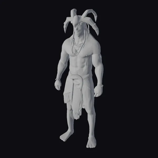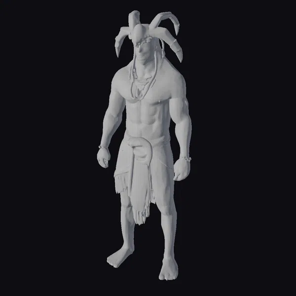 Standing tall with a robust physique, this ancient warrior model boasts a detailed, tanned body covered in striking blue and gold tattoos. His attire consists of a tan loincloth and a distinctive headdress with curved protrusions, adding to his fearsome appearance. The model’s muscular definition, from his chiseled abdomen to his powerful legs, is accentuated by the dynamic lighting that highlights his form against a plain background. The warrior’s facial features are obscured, adding an air of mystery to his already intimidating presence. This model is perfect for projects requiring a strong, ancient character, suitable for use in games, 3D printing, VR/AR experiences, animation, and design projects.