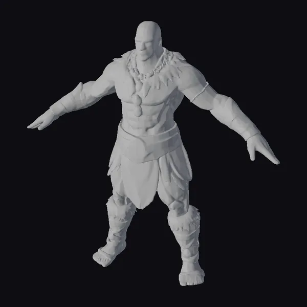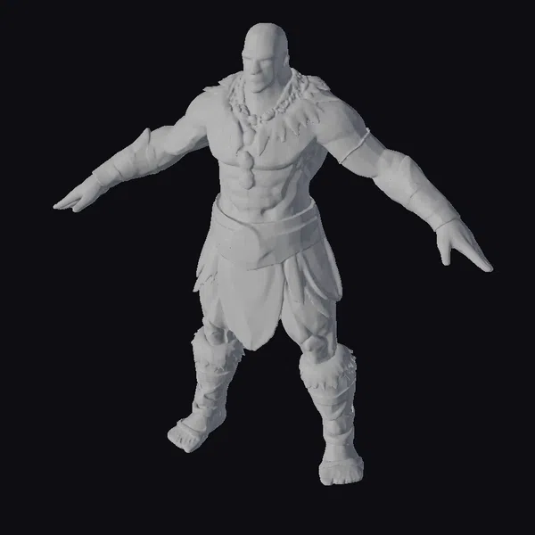 Standing tall with arms outstretched, this ancient warrior exudes a sense of raw power and readiness for battle. His physique is accentuated by a chiseled torso and robust limbs, complemented by a bold array of tribal adornments. The warrior’s attire includes a striking feathered collar, a necklace with a large pendant, and a loincloth adorned with geometric patterns. His arms and legs are wrapped in leather bands, adding to his fierce appearance. The detailed textures and stylized features bring this character to life, making him an ideal addition to any project requiring a strong, heroic presence. Perfect for use in games, animations, or as a design reference.