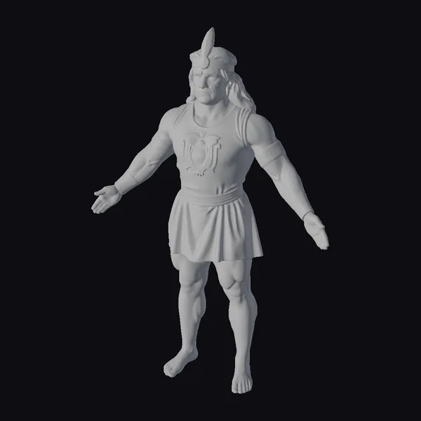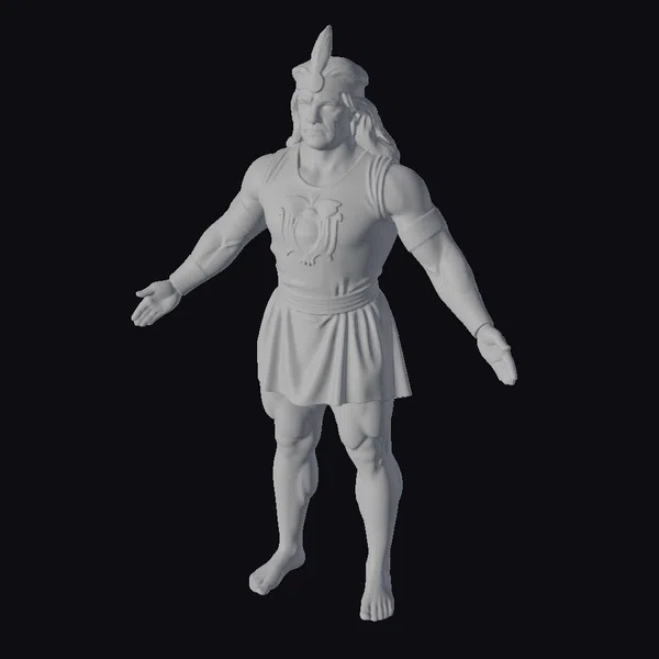 Standing tall with arms outstretched, this ancient warrior’s pose exudes confidence and strength. The stylized 3D model boasts a detailed texture, with a focus on the warrior’s chiseled features and robust physique. The golden headpiece, adorned with a striking plume, adds a touch of regality to the overall appearance. The warrior’s costume, a kaleidoscope of yellow, blue, and red hues, is complemented by a matching belt and cuffs, which add a pop of color to the overall design. The intricate tattoos on the warrior’s arms and torso hint at a rich cultural heritage. This 3D model would be perfect for use in games, animation, or 3D printing, allowing you to bring this ancient warrior to life in a variety of contexts.
