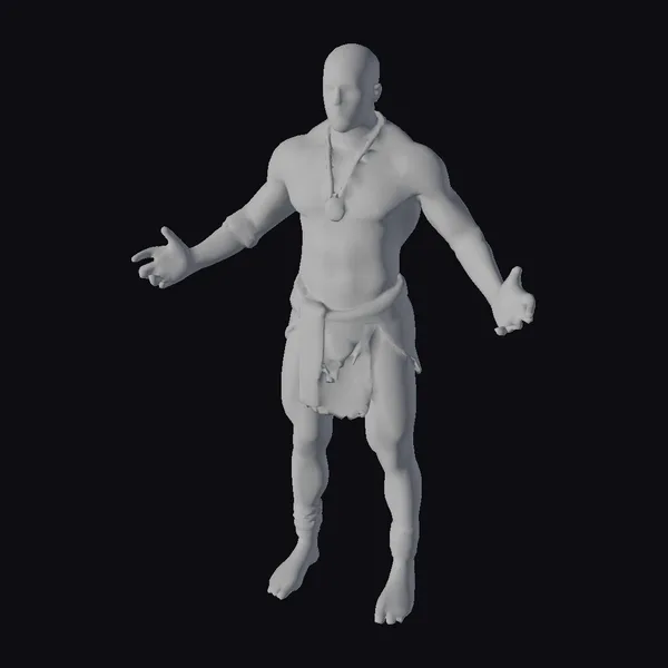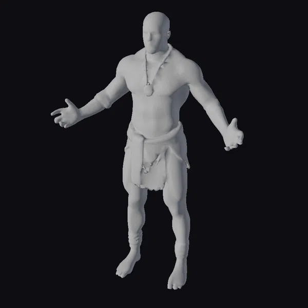 This detailed 3D model of an ancient warrior showcases a perfect blend of realism and stylization. The model features a muscular man with short black hair, standing in a heroic pose with his arms outstretched. His tanned skin has a natural texture, while his golden loincloth and accessories have a detailed, worn look. The jewelry, including a necklace, arm bands, and ankle wraps, has a bronze-like finish that complements his earthy tones. The model’s proportions are well-balanced, making it suitable for various applications such as game development, animation, and 3D printing. The realistic style and attention to detail make this model a great asset for projects requiring an authentic ancient warrior character.