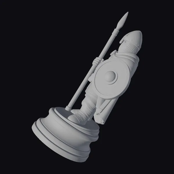 Perched atop a sturdy stone pedestal, the warrior assumes a powerful stance, his body angled as if charging into battle. His armor, a mix of metal and leather, shows signs of wear, suggesting countless skirmishes. The spear, held firmly in his hand, points skyward, while his shield, adorned with a central metal boss, hangs protectively at his side. The metal helmet, complete with a chainmail neck guard, adds to his imposing presence. This level of detail makes the model perfect for use in historical reconstructions, video games, or animated films where authenticity is key.