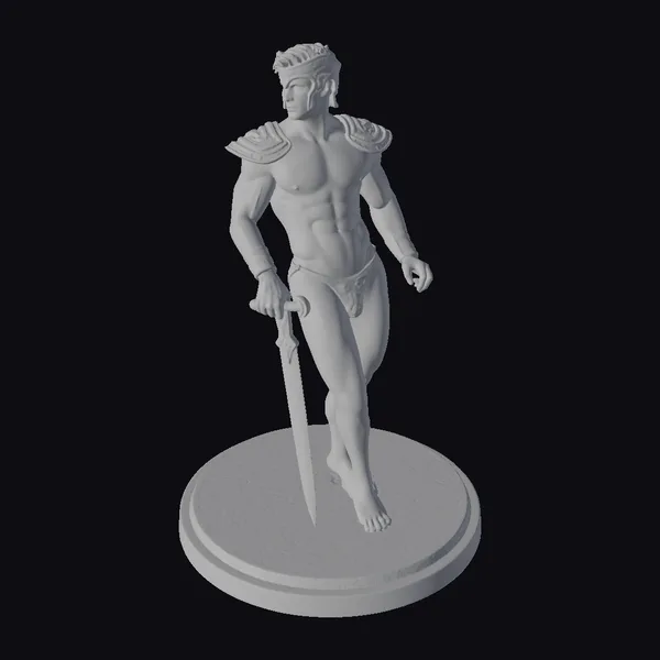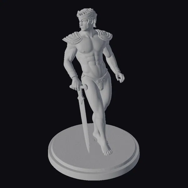 This detailed 3D model depicts a muscular male warrior in a dynamic pose, stepping forward with one foot and holding a sword in his right hand. He wears a distinctive set of ancient armor, including shoulder pads and wrist guards, adding to his heroic stance. The model showcases realistic textures and anatomy, with defined muscles and facial features. The stone base, complete with a weathered appearance, adds a touch of realism to the overall scene. Ideal for use in games, animation, or as a decorative piece, this model brings a sense of ancient heroism to any project.