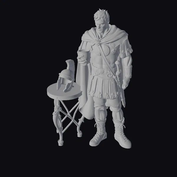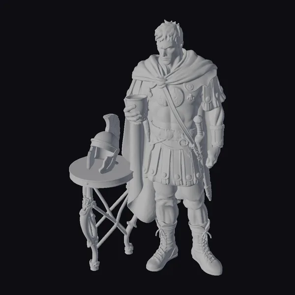 Detailed from the short, spiky black hair to the weathered boots, this Roman warrior exudes a sense of quiet strength. His armor, a mix of silver and gray tones, features intricate details such as rivets and textured plates. A brown leather strap crosses his chest, from which a sword hangs at his side. The warrior’s right hand holds a wine cup, while his left rests by his side, suggesting a moment of pause. To his left, a small, ornate table supports his helmet, which boasts a distinctive black plume. The overall scene captures a serene yet powerful moment, ideal for projects requiring historical authenticity or a touch of ancient heroism. Suitable for games, animation, VR/AR experiences, and design projects.