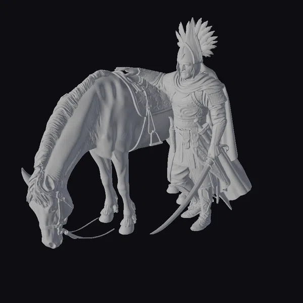 In a pose that commands attention, the warrior stands with one hand resting on the horse’s back, his armor a testament to his status and prowess. The helmet, adorned with feathers, adds a touch of regality, while the cape flows behind him like a river of night. The horse, with its head bowed, seems to share a moment of quiet companionship with its rider. This 3D model captures the essence of ancient warfare and the bond between a warrior and his steed, making it perfect for projects that require a touch of history and heroism, such as games, animations, or historical reconstructions.