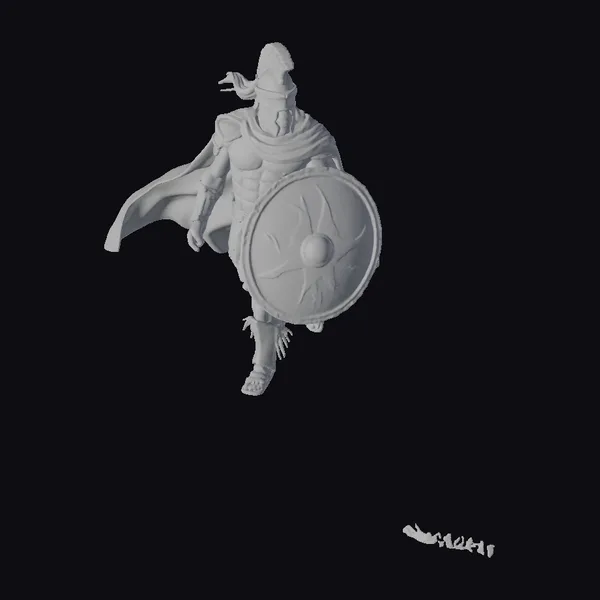 In a powerful stance, the ancient warrior grasps a sturdy shield adorned with a striking golden emblem, while wearing a helmet and armor that shines with a metallic sheen. The flowing red cape billows behind, adding a dynamic touch to the overall appearance. The stylized illustration brings a sense of fantasy and heroism to the character. The intricate details on the armor, shield, and cape create a visually stunning model perfect for various applications, including games, animation, and design projects.