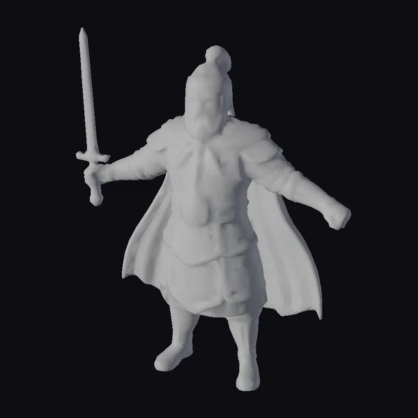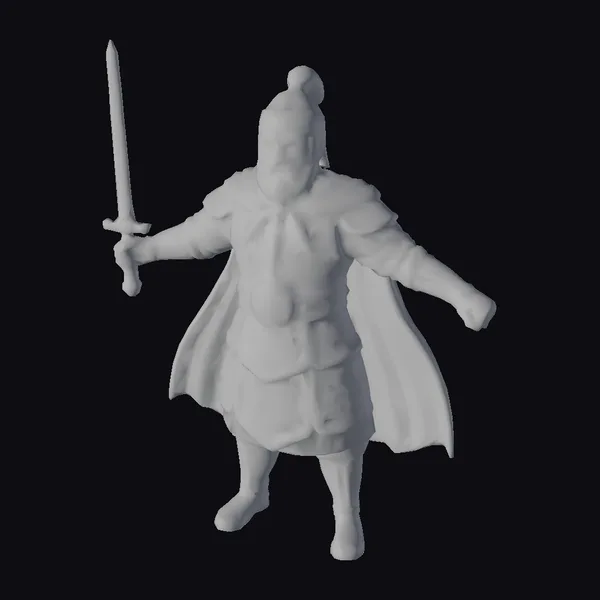 Standing tall with a powerful presence, this ancient warrior is captured in a dynamic pose, his armor a testament to the craftsmanship of a bygone era. The intricately scaled metal armor, complemented by gold accents, shines with a sense of battle-readiness. A vibrant red cape flows behind him, contrasting with the metallic hues of his armor and the stern expression on his bearded face. The warrior’s sword, held firmly in his right hand, points towards the sky, symbolizing his unyielding spirit. This model is perfect for projects requiring a medieval or ancient setting, such as games, animations, or historical reconstructions. Its detailed features and realistic style make it an excellent choice for adding depth and authenticity to any scene.