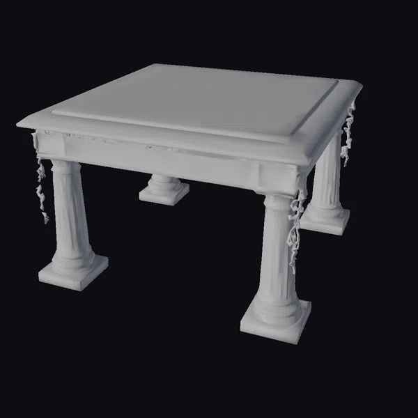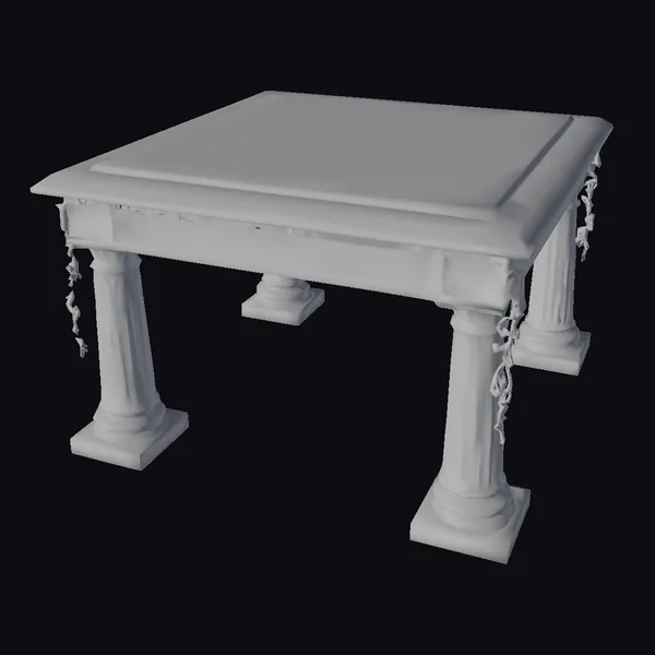 Positioned at a slight angle, the table’s square top showcases a beautiful white marble finish with intricate green veins, while its four fluted legs are adorned with delicate green vines that appear to be crawling up from the base. The table’s design is reminiscent of ancient Greek architecture, with clean lines and a sense of classical proportion. The level of detail is exceptional, with realistic textures and subtle shading that gives the model a lifelike appearance. This model would be perfect for use in architectural visualizations, interior design projects, games, or VR/AR experiences where a touch of classical elegance is desired.