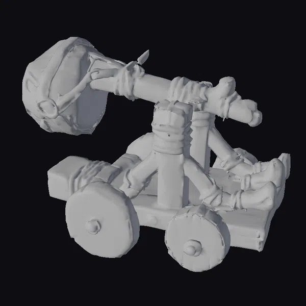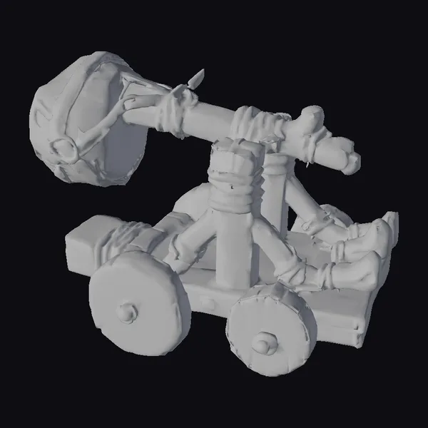 Perched on its sturdy wooden base, this stylized catapult model exudes an aura of antiquity, its wooden beams wrapped in frayed ropes and adorned with a large stone projectile, ready to be launched. The wheels, one stone-gray and the other darker, add to its rugged appeal. As light casts upon its structure, the catapult’s texture and intricate details come alive, making it an excellent addition to any historical, fantasy, or gaming environment. Its applications are vast – from game developers looking for authentic medieval assets to architects and designers seeking inspiration for historical reconstructions or fantastical landscapes.