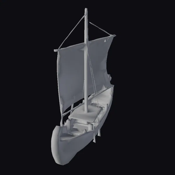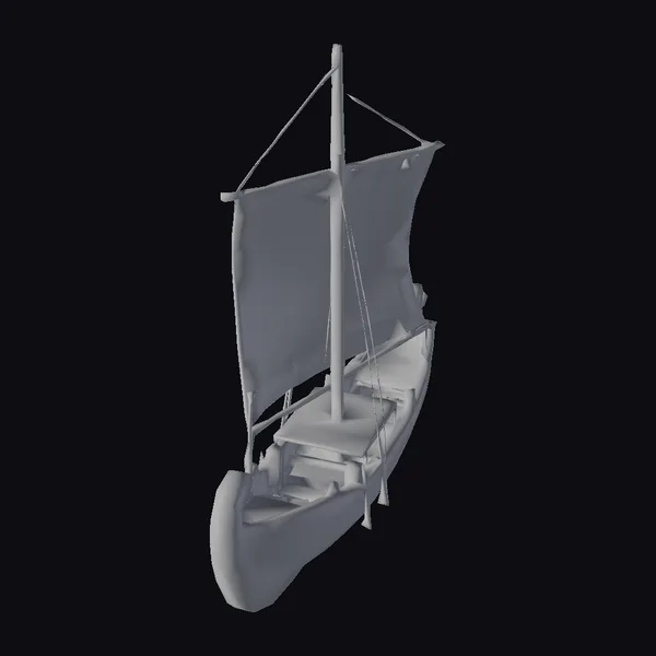 Perched at a slight angle, the sailboat’s wooden hull and deck are meticulously textured to resemble aged wood, complete with visible grain and subtle weathering. The sail, a soft cream color, features an elegant design with star motifs and a central spiral pattern. A sturdy mast and rigging add to the sense of authenticity. This model is perfect for use in historical or fantasy settings, ideal for games, 3D printing, VR/AR experiences, animation, and design projects. Its detailed craftsmanship and nostalgic charm make it a standout asset.