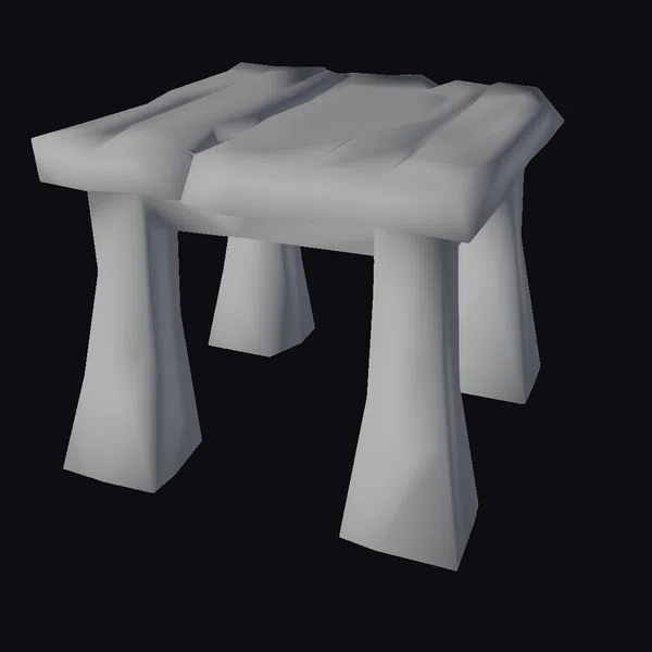 Positioned at a slight angle, the table’s thick, flat top appears worn, as if bearing the marks of countless years of use. The legs, sturdy and trapezoidal in shape, taper slightly towards the bottom, providing stability while adding to the piece’s ancient charm. The low-poly style accentuates the table’s geometric simplicity, making it a perfect fit for fantasy or rustic-themed environments. Its detailed texture and earthy tones can instantly add warmth and character to any digital scene, from games and animations to virtual reality experiences and architectural designs.