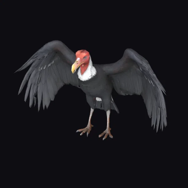 The Andean condor stands tall with its wings spread wide, showcasing its impressive wingspan. The model’s black feathers are meticulously detailed, with subtle texture variations that catch the light. The condor’s red head and bare face are striking, complemented by a distinctive white neck ruff. Its sharp, yellow beak adds a pop of color, while its brown legs and feet appear strong and sturdy. This 3D model is perfect for projects requiring a realistic and dramatic bird presence, such as wildlife animations, documentaries, or games set in South American landscapes.