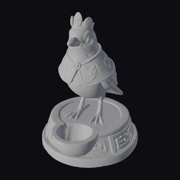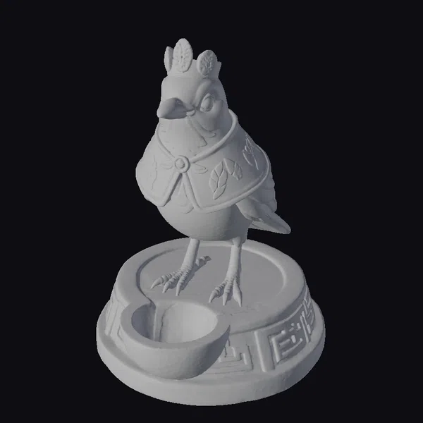 In a stately pose, the Andean thrush statue commands attention with its imposing presence. The bird’s body is rendered in exquisite detail, from the delicate feathers suggested by the stone texture to the sharp, curved beak. A crown of leaves crowns its head, while an ornate cape with leaf patterns drapes elegantly over its shoulders. The statue stands firmly on a round, carved base adorned with a Greek key pattern and a small, circular recess. The entire piece is infused with a sense of history and mysticism, perfect for projects requiring an air of ancient ceremonial grandeur. Ideal for use in games, 3D printing, VR/AR experiences, animation, and design projects.
