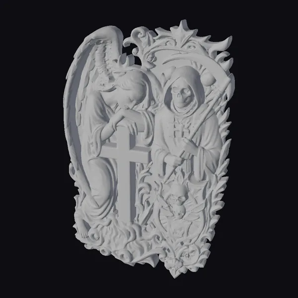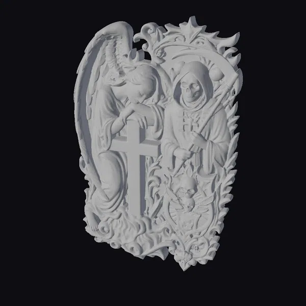 This intricately detailed relief sculpture presents a poignant juxtaposition of life and death, as an angel and the grim reaper are depicted together in a shared moment. The angel, with delicate wings and a serene expression, rests its chin on a cross, symbolizing peace and eternal rest. Conversely, the grim reaper stands resolute, its skeletal form draped in a hooded cloak, clutching a scythe and a skull, emblematic of mortality. The entire scene is encased in an ornate, gothic-inspired frame, replete with leaf-like motifs and a textured background that adds depth and complexity. Crafted with precision, this model showcases a golden bronze finish that enhances its dramatic and contemplative mood. Ideal for use in games, 3D printing, VR/AR experiences, animation, and design projects seeking to incorporate elements of contrast and narrative depth.