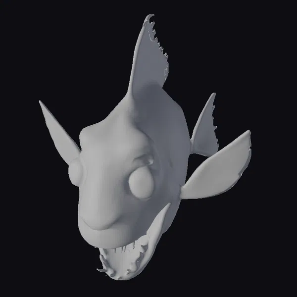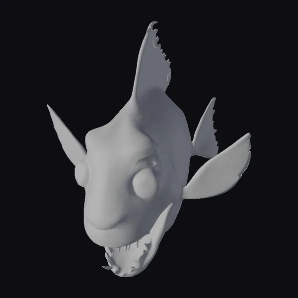 Positioned in a menacing gaze, this stylized anglerfish head boasts an exaggerated appearance. Its body is a mesmerizing dance of dark gray and orange, with the fins and tail showcasing a gradient of orange and purple. The eyes, large and round, gleam with an otherworldly intensity, while the mouth open wide reveals a cavernous interior lined with sharp, pointed teeth. Such a model would be perfect for adding a touch of horror or fantasy to games, animations, or 3D prints. The stylized features make it an excellent choice for projects requiring a non-realistic yet captivating visual impact.