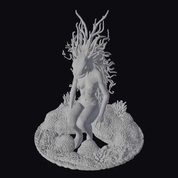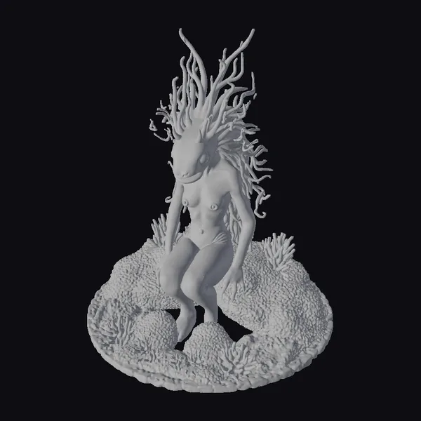 Perched on a rocky outcrop surrounded by coral and seaweed, this stunning anglerfish humanoid female radiates an ethereal charm. Her body is a mesmerizing blend of human and fish, with shimmering blue skin that catches the light. The delicate seaweed-like protrusions on her head add a touch of whimsy, while her yellow eyes seem to glow with an inner light. The model showcases exceptional detail, from the texture of her skin to the intricate coral formations. This model would be perfect for use in games, animation, or 3D printing, offering endless possibilities for creative expression.