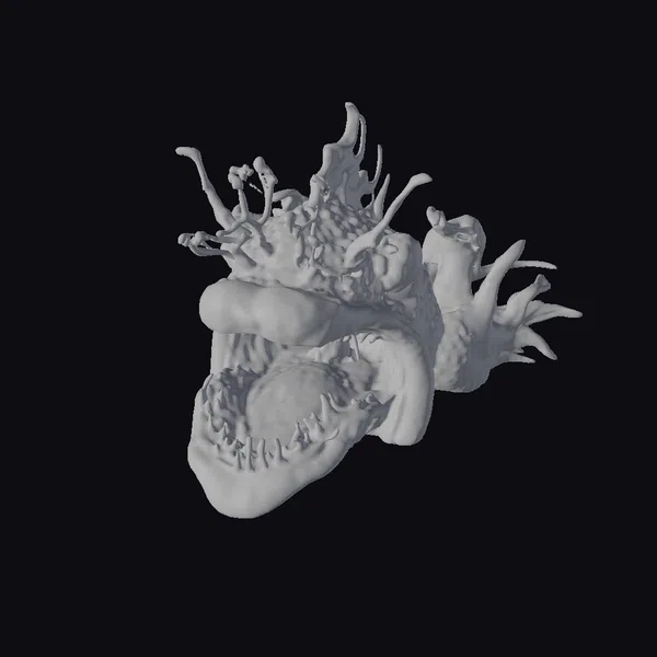 Behold the terrifying visage of an anglerfish-like creature, its mouth agape, revealing rows of dagger-sharp teeth. The model’s textured, orange-brown skin appears almost translucent in certain areas, while wavy, fleshy growths protrude from its head, evoking an otherworldly bioluminescence. The creature’s leftward gaze seems to pierce through the darkness, as if sensing its next victim. This 3D model would be perfect for adding a touch of aquatic horror to games, animations, or VR experiences. Its unique blend of anglerfish and monstrous features makes it an excellent choice for designers seeking to create an unsettling atmosphere.
