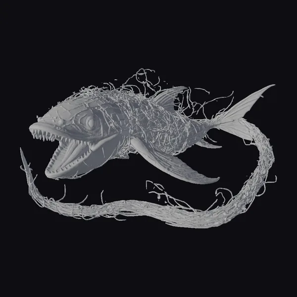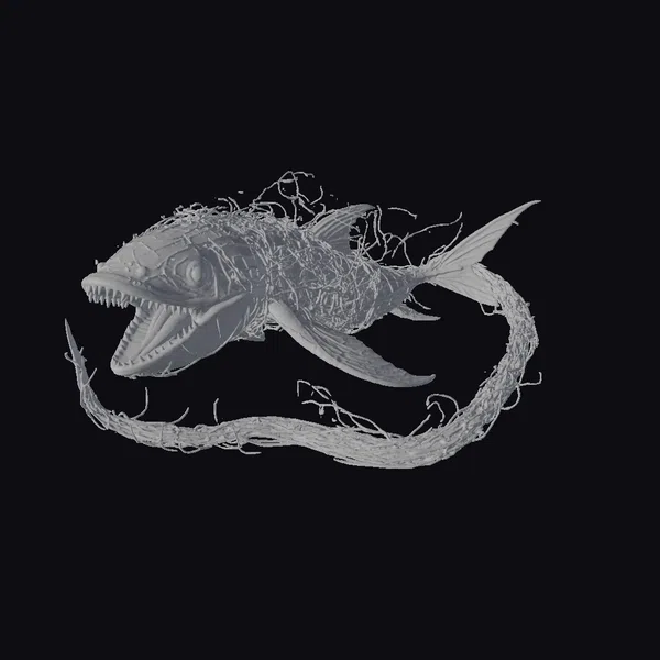 In a twisted fusion of organic and metallic elements, this anglerfish model boasts a body covered in dark, tangled tentacles that resemble thorns or wires. The fish’s mouth is wide open, revealing rows of sharp, pointed teeth, giving it a menacing appearance. Its bioluminescent lure on top of its head emits a faint, eerie glow, adding to the creature’s otherworldly aura. The model’s texture combines smooth, metallic surfaces with rougher, more organic details, creating a captivating contrast. Ideal for use in dark fantasy or sci-fi projects, horror movies, or video games, this model can add a touch of unease and mystery to any scene. Its unique design makes it perfect for 3D printing, animation, or virtual reality experiences.
