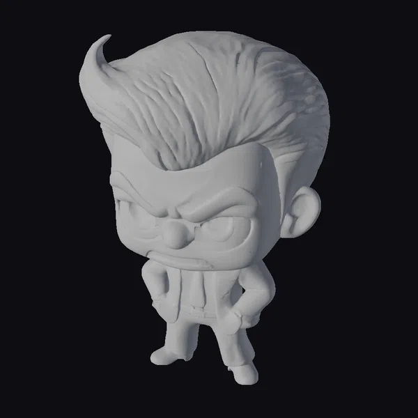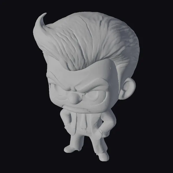 Detailed with precision, this cartoon businessman stands with his hands tucked into his pockets, sporting a scowl that could curdle milk. His hair is styled in a distinctive swoop, and his brown eyes seem to bore into those he meets. The blue suit, complete with a crisp white shirt and matching tie, contrasts sharply with his brown shoes. This character model is perfect for animations, games, or any project requiring a quirky office worker. Its stylized features ensure it will add a dash of humor to any scene.