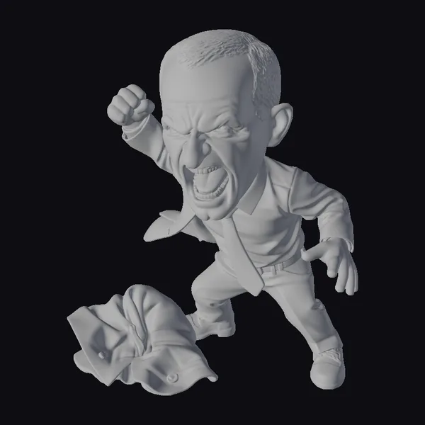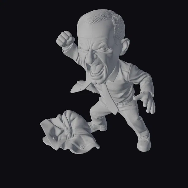 In a dynamic pose, the businessman stands with his right fist clenched and raised, while his left arm extends outward, palm down. His mouth is wide open in a shout, and his facial expression is one of extreme anger. The model showcases a cartoonish style with exaggerated features, including a large head and expressive face. The outfit consists of a white dress shirt with a black tie, black suit pants, and black shoes. The jacket lies crumpled on the ground beside him, suggesting a sudden and intense reaction. This model is perfect for projects requiring a character with a strong emotional presence, such as animations, games, or office-themed designs.