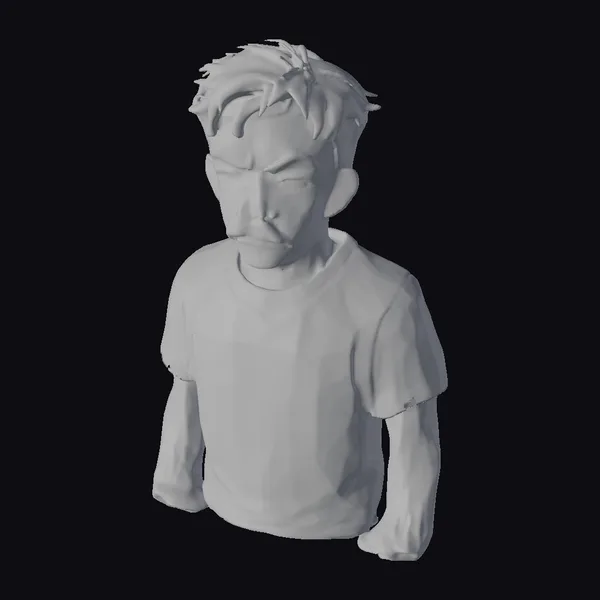 This stylized character model depicts a man with a distinctive appearance, featuring a thick mustache and short, dark hair. He wears a plain black t-shirt, and his facial expression is one of intense contemplation or anger. The model showcases a dynamic pose with clenched fists, suggesting readiness for action. The stylized cartoon style gives the character a unique, animated feel, making him suitable for various creative projects such as animations, games, or virtual reality experiences. His design allows for versatile use, enabling artists and developers to integrate him into different narratives or scenes with ease.