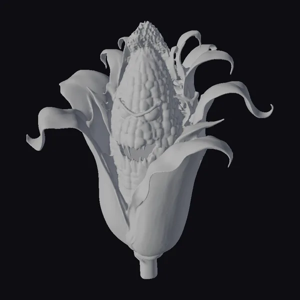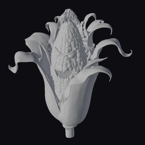 Perched menacingly on its stalk, this corn on cob appears to be bursting with an inner fury. The kernels form a scowling face, complete with sharp, pointed teeth and piercing eyes. The green leaves surrounding the cob are curled and twisted, adding to the overall sense of unease. The model’s stylized appearance makes it perfect for use in animation, games, or 3D printing. Its unique blend of cute and creepy will undoubtedly make it a standout in any project, from horror-themed designs to more lighthearted, humorous applications.