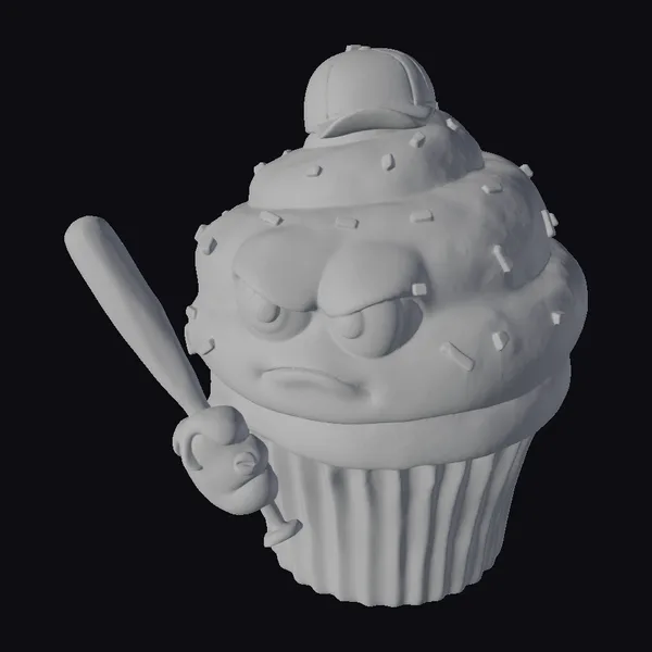 Detailed with precision, this cartoon-style cupcake character stands ready for action. The pink frosting atop its brown cupcake base is swirled into peaks and valleys, covered in a medley of colorful sprinkles that catch the light. A brown baseball cap rests atop the frosting, adding to the character’s playful yet aggressive demeanor. The cupcake’s facial expression is one of anger, with furrowed brows and a downturned mouth. Its white glove grips a wooden baseball bat firmly, as if prepared to swing at any moment. This model is perfect for use in animations, games, or as a unique decorative piece. Its whimsical design and detailed textures make it a standout addition to any project.