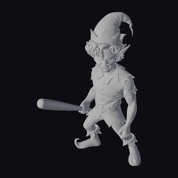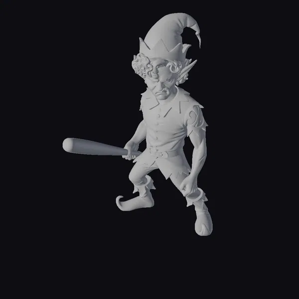 Standing tall with a dynamic pose, this stylized elf warrior exudes an aura of unbridled aggression. His curly blonde hair peeks out from under a pointed red and green hat, while his bright green shirt and pants are torn and frayed, revealing a glimpse of his muscular physique. The elf’s face is twisted in a snarl, showcasing his sharp teeth and furrowed brow. He grasps a sturdy baseball bat in his right hand, at the ready to strike. This 3D model would be perfect for games, animations, or designs seeking a bold, fantastical character. Its high level of detail and stylized features make it an excellent choice for projects requiring a unique, eye-catching elf character.