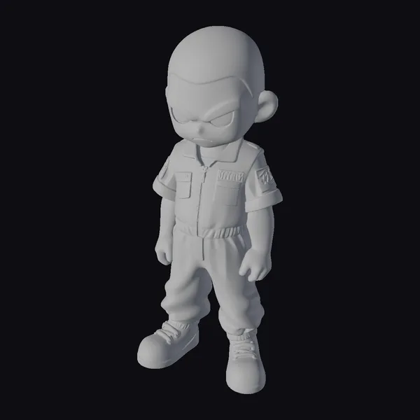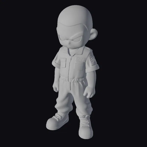 Detailed with precision, this action figure depicts a prisoner with a notably angry expression, characterized by a bald head and a scowl. The figure wears an orange jumpsuit with a zipper down the front and patches on the chest and arm, complete with black shoes that provide a grounded stance. The pose suggests a moment of tension, with arms slightly bent and fists implied but not clenched. The stylized cartoon approach gives the figure a unique, almost endearing quality despite its angry face. Suitable for use in animations, games, or as a detailed addition to 3D scenes, this model brings a specific character to life.