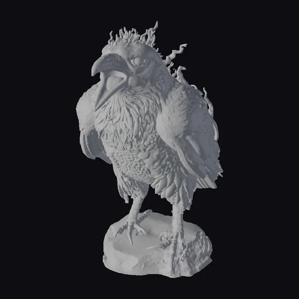 This fantastical creature stands proudly on a jagged rock base, its body a mesmerizing blend of raven and phoenix features. The bird’s mouth is wide open, revealing a sharp beak as it lets out a mighty roar. Its eyes burn with an eerie, orange-red light, while tendrils of purple flame appear to erupt from its head and back. The creature’s feathers are a mix of dark, muted tones with hints of fiery orange and red, giving it a hauntingly beautiful appearance. The level of detail is exceptional, with intricate textures and shading that bring this mythical creature to life. Ideal for use in games, animation, or 3D printing, this model is sure to add a touch of dark fantasy to any project.