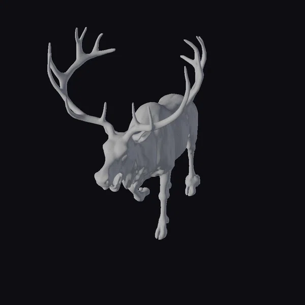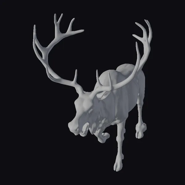 Positioned in a dynamic stride, this reindeer’s body is angled to the left, showcasing its powerful legs and sharp hooves. Its antlers stretch upwards, adding to its imposing presence. The reindeer’s fur is a mix of brown and white, with a distinctive white patch around its neck. A bright red nose glows at the end of its snout, contrasting with the red splotches on its body. The stylized model captures a moment of raw energy, perfect for adding a touch of holiday chaos to any scene. Ideal for use in animations, games, or as a unique decorative piece.