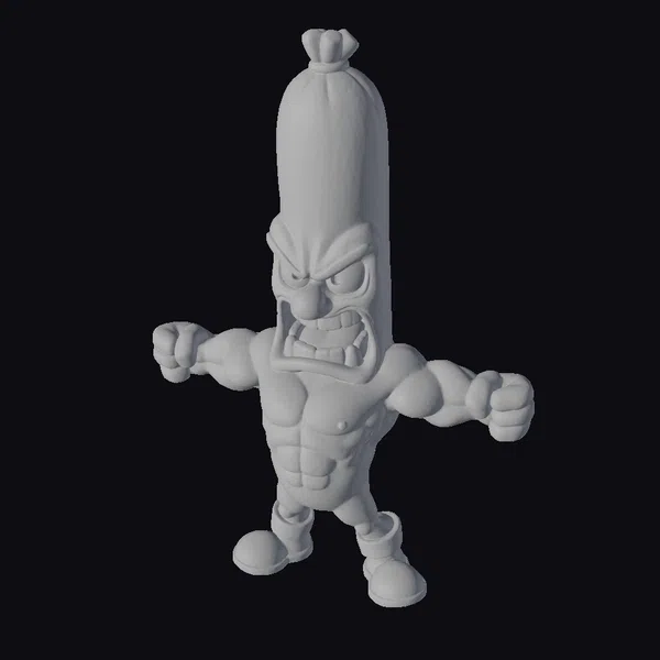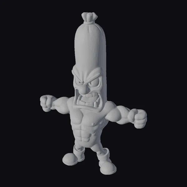 Detailed with precision, this 3D model of an angry sausage character showcases a dynamic pose with clenched fists and a furious facial expression. The sausage’s body is rendered with a shiny, smooth texture, emphasizing its cartoonish appeal. Its brown boots add a touch of grounding to the otherwise whimsical design. This character model is perfect for animations, games, or any creative project requiring a humorous and eye-catching element. Its unique design ensures it stands out, making it ideal for projects that aim to entertain or engage a younger audience.