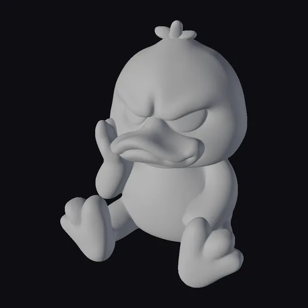 Detailed with a distinctive tuft of hair on top of its head, this angry duck model showcases intricate textures and a well-proportioned physique. The character’s pose, with one hand resting on its cheek and the other on the ground, adds to its comically disgruntled demeanor. Suitable for animations, games, or as a quirky decorative piece, this model is sure to capture attention. Its cartoonish style allows for versatile applications, from children’s entertainment to adult humor.