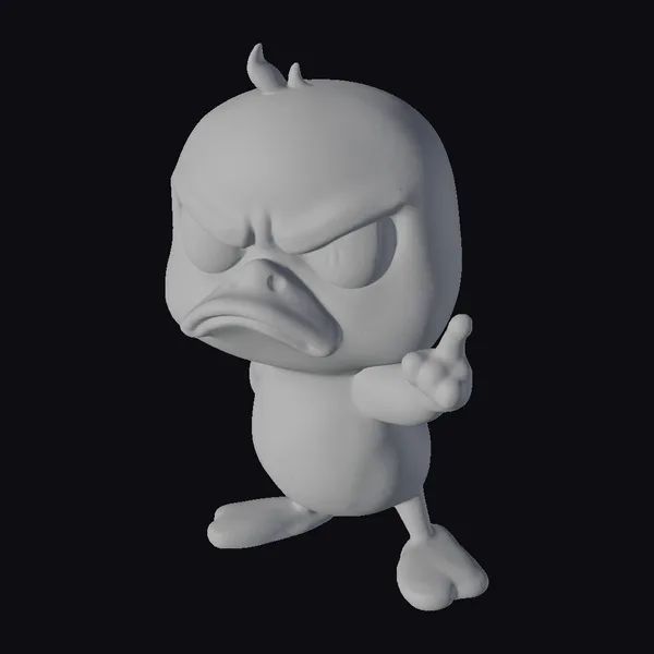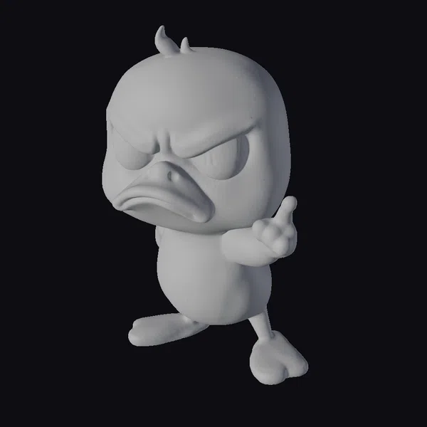 Detailed with a scowl and a gesture, this cartoon duckling boasts a vibrant yellow plumage and a distinctive orange beak. Its large, expressive eyes and furrowed brow amplify its angry demeanor. Positioned with one foot forward and the other back, it appears ready to pounce or confront. The model showcases smooth textures and a stylized appearance typical of cartoon characters. Ideal for animations, games, or as a quirky decorative piece, this model brings a touch of humor and personality to any project or design.