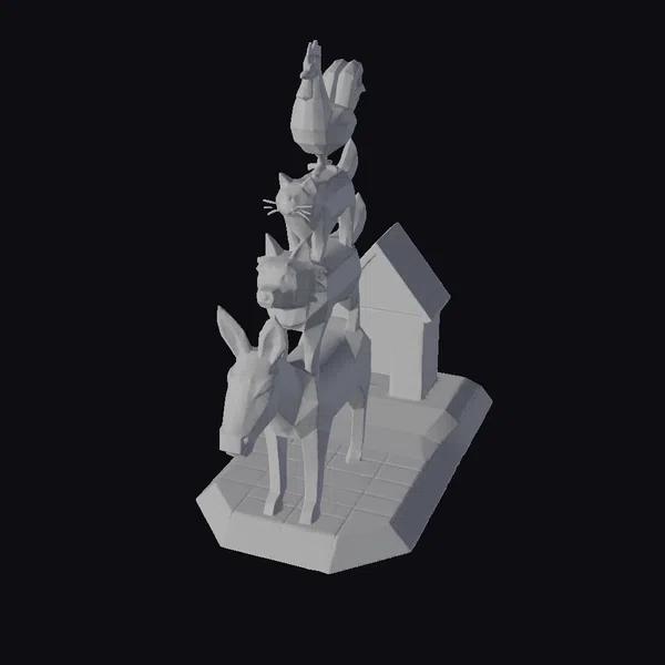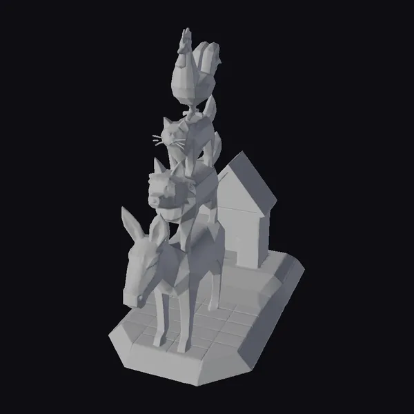 Detailed within this model is a meticulously stacked arrangement of animals, starting with a donkey at the base, followed by a dog, a cat, a rabbit, and finally a rooster at the very top. The model boasts a stylized, low-poly aesthetic with a focus on geometric shapes and clean lines. The animals are positioned on a wooden platform that leads to a small doghouse with a red roof, set against a backdrop of green grass. The entire scene exudes a playful and whimsical mood, making it perfect for use in games, animations, or as a decorative piece. The model’s unique blend of textures and colors brings to life a fantastical moment that captures the imagination.
