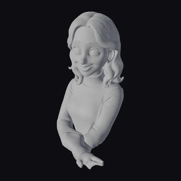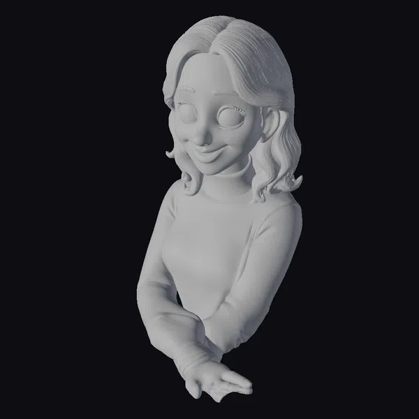 This charming cartoon-style 3D model features a young woman with a radiant smile, brown shoulder-length hair, and expressive eyes, all set against a crisp white background. She is dressed in a fitted black turtleneck that accentuates her youthful appearance. The model’s pose, with her arms slightly bent and hands together, adds to her approachable demeanor. Her facial features are well-defined, with a slight blush on her cheeks enhancing her friendly look. The model’s texture and lighting are smooth and even, making her look both modern and endearing. Ideal for use in animations, games, or as a character in virtual environments, this model is versatile and engaging.