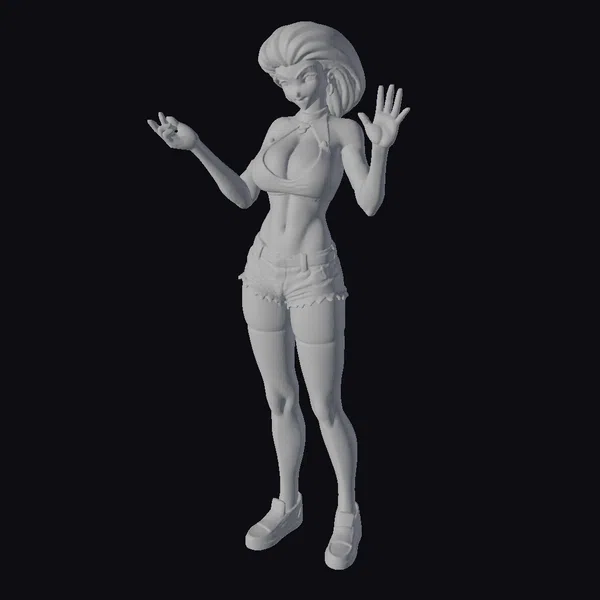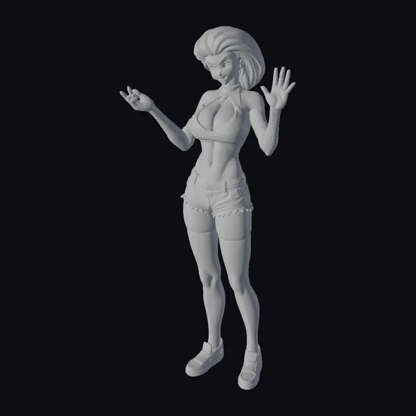 Detailed with precision, this animated woman showcases a striking purple hairstyle paired with a daring black bra top, short denim shorts, and thigh-high socks. Her pose exudes confidence and playfulness, with hands raised in a gesture of expression. The model’s stylized features and vibrant colors make her an ideal asset for animations, games, or any project in need of a lively character. The detailed textures and dynamic pose ensure a high level of realism within an animated context, making her versatile for various creative applications.