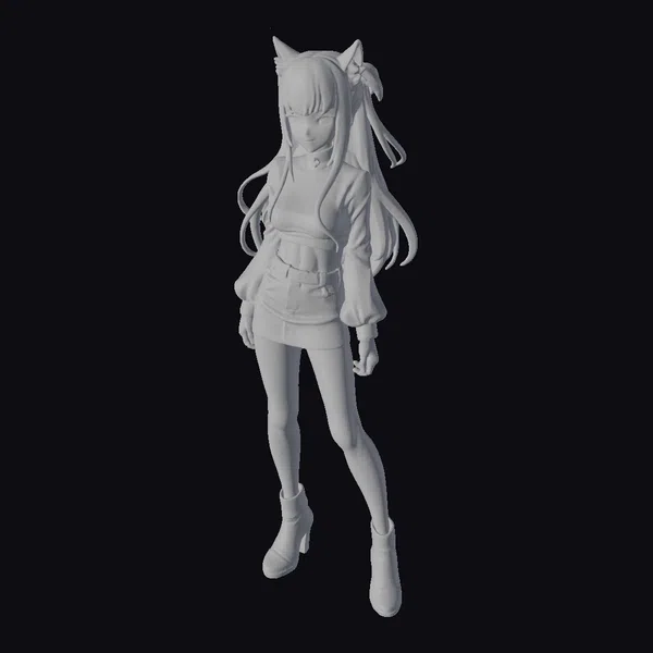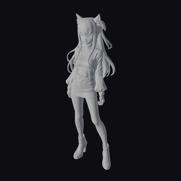 Detailed with precision, this anime-style figurine showcases a girl in a dynamic pose, her body angled slightly to one side as if she’s about to step into the scene. Her outfit is a perfect blend of edgy and chic: a red jacket with black cuffs and collar, a black mini skirt, fishnet stockings, and striking red boots. Her long black hair flows down her back, adorned with red and black cat ear headbands that add a playful touch. The intricate details, from the texture of her clothing to the expression on her face, make this model a standout. Ideal for use in animations, games, or as a decorative piece, this model is sure to capture attention.