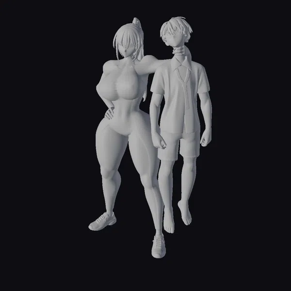 Detailed examination reveals the boy’s school uniform is meticulously designed, with a red tie adding a pop of color against the white shirt. His black hair and bare feet contrast with the girl’s blonde hair and fully dressed appearance. She sports a sleek outfit that accentuates her pose, one hand on her hip. The grayscale effect on parts of her body adds a unique artistic touch. This model is perfect for animators and game developers looking for characters that exude personality and style. Use them to bring life to your stories, games, or animations with an anime flair.