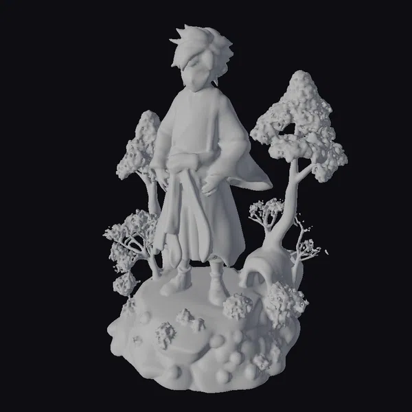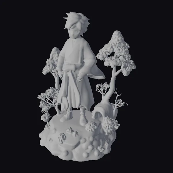 In a harmonious blend of human-like and fantastical elements, this anime-style figurine presents a young boy with striking gray hair and expressive facial features. He wears a meticulously designed outfit consisting of a predominantly orange and brown robe over a gray and white ensemble, complemented by orange sandals. The figure stands on a detailed rocky base adorned with small trees and green moss, enhancing the natural ambiance. The intricate details in the outfit, facial features, and the serene expression of the boy make this model a captivating piece. Ideal for use in games, 3D printing, VR/AR experiences, animation, and design projects, this model brings a touch of fantasy and youthfulness to any creative endeavor.