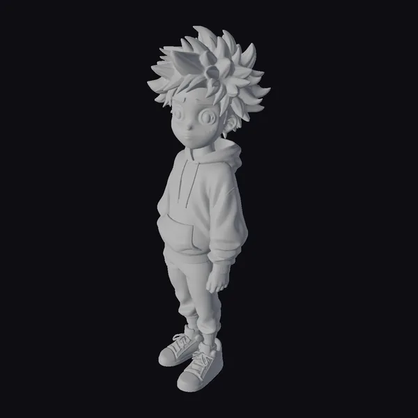 Imagine a vibrant anime boy with a contagious grin, sporting a green hoodie and spiky black hair with yellow highlights. His expressive eyes and dynamic pose capture a moment of pure excitement. The model features a detailed texture, giving it a lively and youthful appearance.