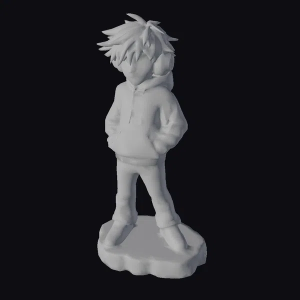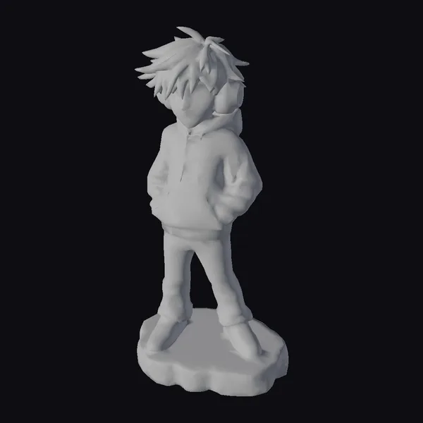 Detailed anime-style boy with spiky black hair and expressive eyes, dressed in a casual outfit consisting of a black hoodie with a hood up, light blue jeans, and black sneakers. His vibrant pink and blue headphones with RGB lights add a pop of color. He stands on a simple gray base with hands tucked into his hoodie pockets. This model excels in games, animation, and virtual reality applications, offering a youthful character with a modern aesthetic.