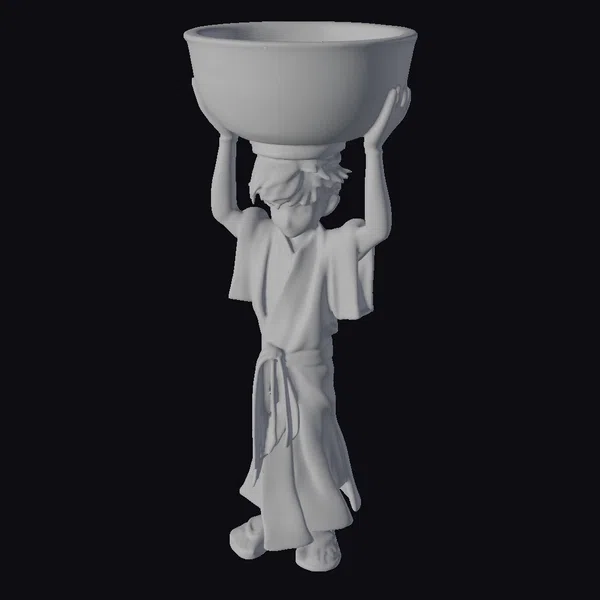 This meticulously crafted anime-style figurine showcases a young boy in a tranquil pose, lifting a substantial, elaborately designed bowl above his head. The boy’s attire consists of a flowing beige garment cinched at the waist with a gray sash, complemented by beige footwear. His dark hair and serene facial expression add to the figurine’s charm. The bowl, predominantly dark with gold accents, features an intricate design that adds a layer of sophistication. The figurine’s detailed textures, balanced pose, and the interplay of light on the subjects make it a captivating piece. Ideal for enthusiasts of anime and collectors of detailed figurines, this model is perfect for use in games, 3D printing, VR/AR experiences, animation projects, and design visualizations.