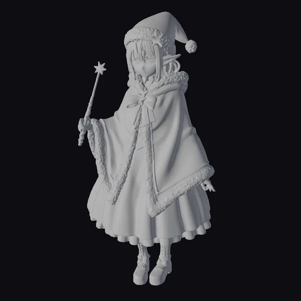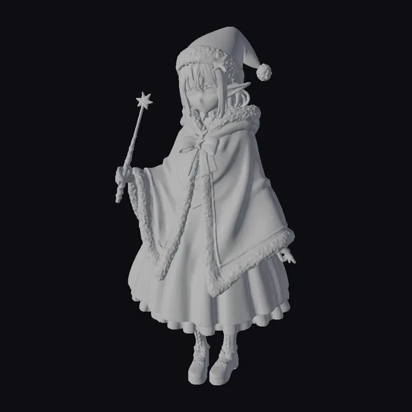 Standing tall with a gentle demeanor, this stylized anime girl is dressed in a meticulously detailed Santa outfit. Her red cloak with white fur trim is complemented by a black dress with a large bow at the neckline, and she wears black boots that add a sleek contrast to her festive attire. The cloak’s hem and cuffs are richly textured, suggesting soft fur. A Santa hat tops her light blue hair, which is styled in a way that accentuates her serene and mystical aura. In her hand, she holds a wand that tapers to a star-shaped tip, symbolizing her role as a bringer of joy and magic. The model is highly detailed, with intricate textures and a vibrant color palette that captures the essence of the holiday season. Ideal for use in animations, games, or as a decorative piece, this model brings a touch of anime charm to any project.