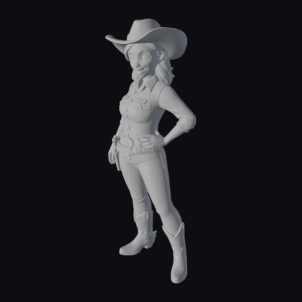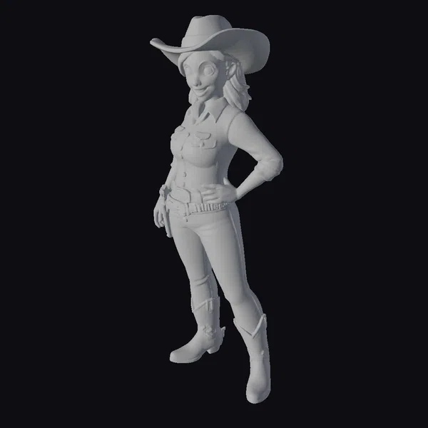 Detailed with precision, this stylized cowgirl boasts a dynamic pose that captures her adventurous spirit. Her brown cowboy hat sits atop her shoulder-length dark hair, framing her face with a bright smile. The yellow shirt with rolled-up sleeves and blue jeans create a casual yet bold look, complemented by her brown boots and wide leather belt. A holstered gun adds a touch of ruggedness to her outfit. Perfect for projects requiring a lively, cartoonish character, she can bring life to games, animations, or designs with her charming presence.