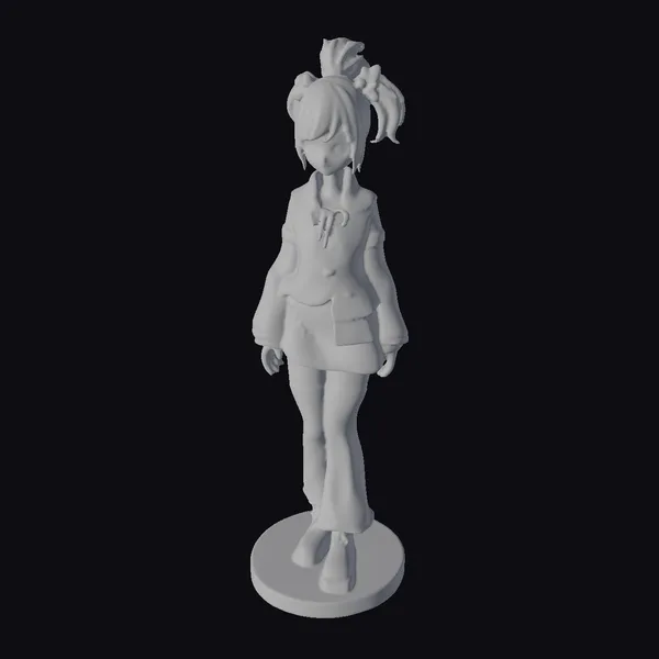 This exquisite anime girl figurine stands out with her meticulously crafted features, from the detailed strands of her gray hair tied up in pigtails to the expressive facial features that capture a serene moment. She is dressed in a stylish white jacket adorned with a black bow, paired with a layered gray skirt that adds a touch of playfulness. Her white thigh-high socks and gray shoes with distinctive yellow accents complete her school-inspired outfit. The figurine is mounted on a detailed lifesized landscape base, enhancing its overall presence. The high level of detail in this model makes it perfect for various applications, including games, 3D printing, VR/AR experiences, animation, and design projects, where a realistic and engaging character is required.